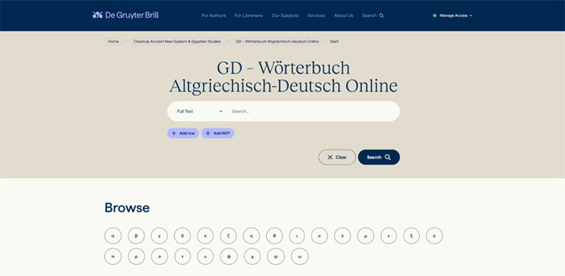 古希腊语德语词典完整覆盖了古希腊语自古典时期至拜占庭早期的历史发展脉络,其资料来源包括文学文本、纸莎草文献和铭文。该数据库具有友好的用户界面、清晰的结构和呈现方式以及大量的翻译示例。